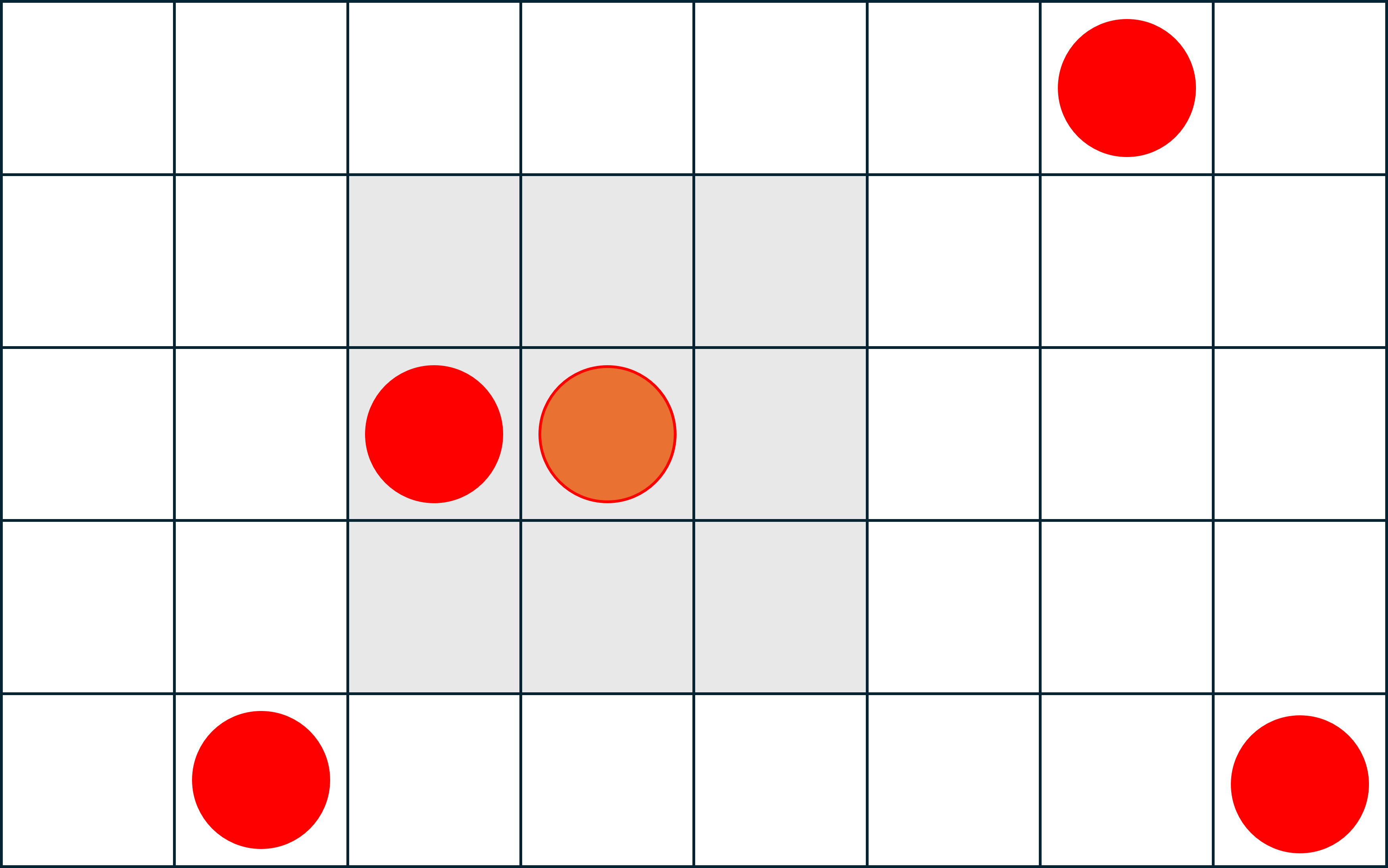In onderstaande figuur is dat weergegeven. Het lichtrode deeltje heeft potentieel maar negen mogelijke botsingen. Dat script kan verder geoptimaliseerd worden door van links naar rechts per grid te lopen, dan hoeven zelfs niet alle velden bekeken te worden.